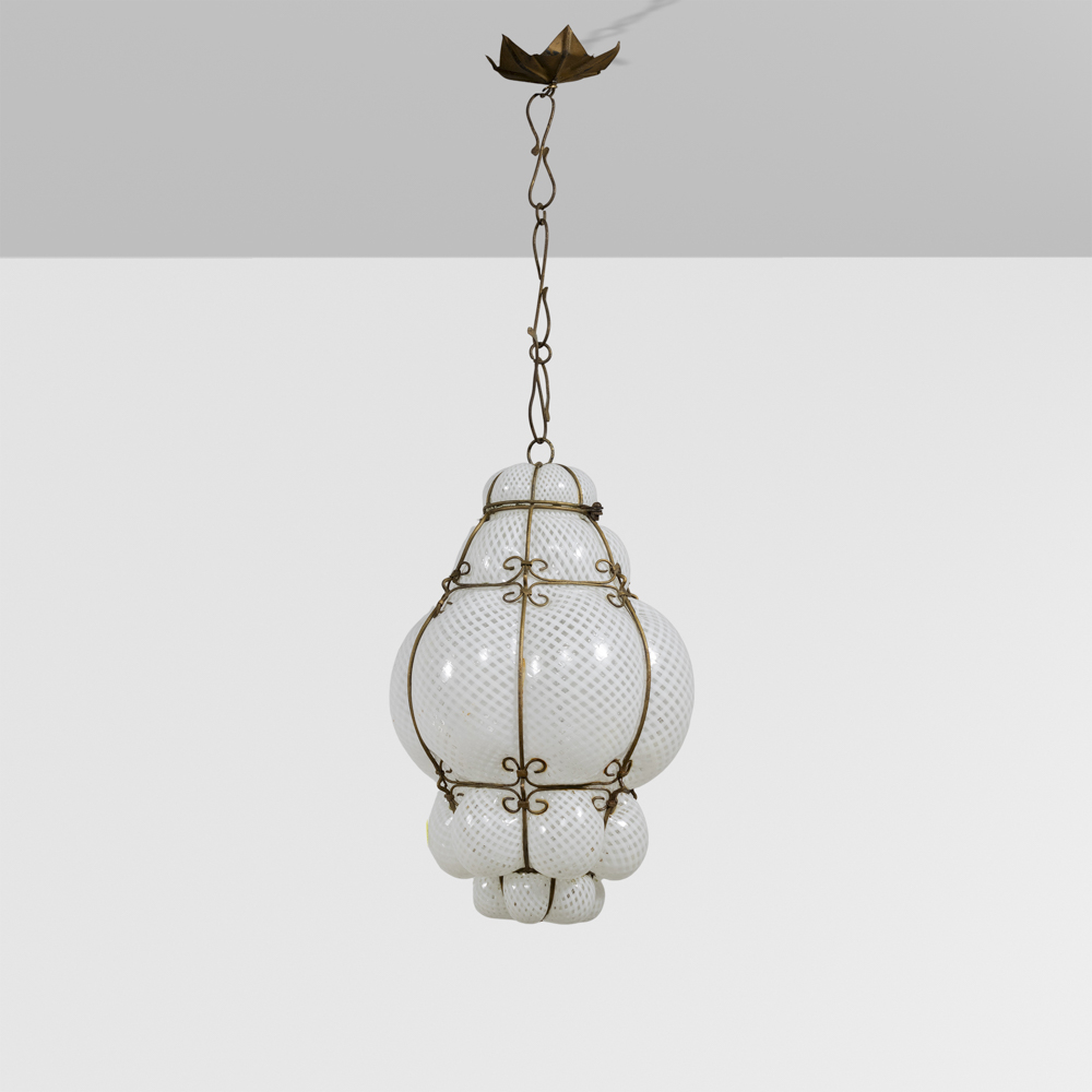 Prod. Venini, attribuitoMurano, anni 30-40h. 80 cm.lampada a sospensione in ottone e vetro reticello