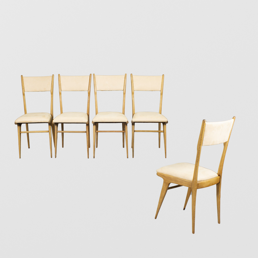 Silvio Cavatorta, attribuito (5)Italia, anni 5094x41,5x45 cm.cinque sedie in legno e tessuto imbottito