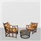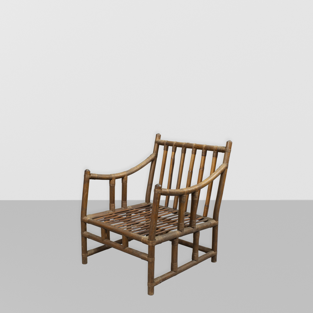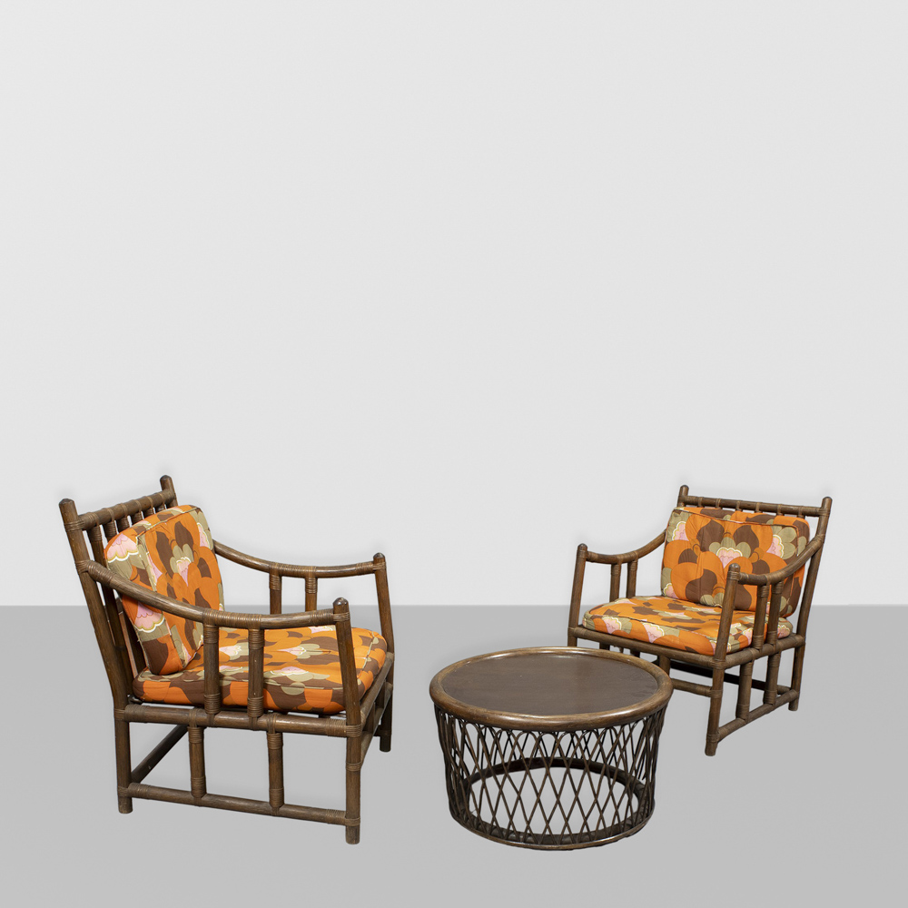 Prod. Vivai Del Sud (3)Italia, anni 70poltrone 83x68x75 cm. - tavolino 41x70 cm.coppia di poltrone con tavolino in bambù, midollino, legno e tessuto imbottito