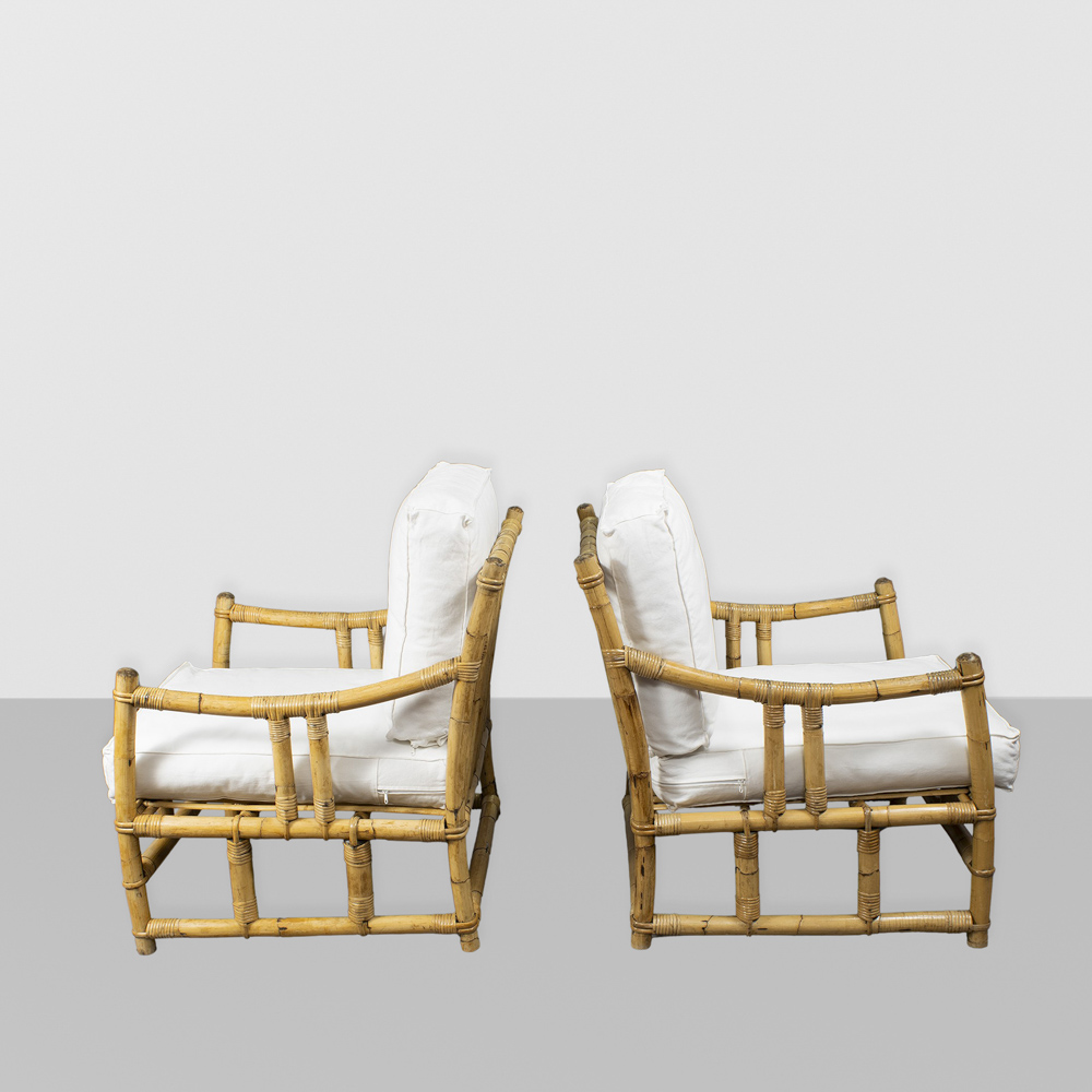 Prod. Vivai Del Sud, attribuito (2)Italia, anni 7077x67x80 cm.coppia di poltrone in bambù, midollino e tessuto imbottito