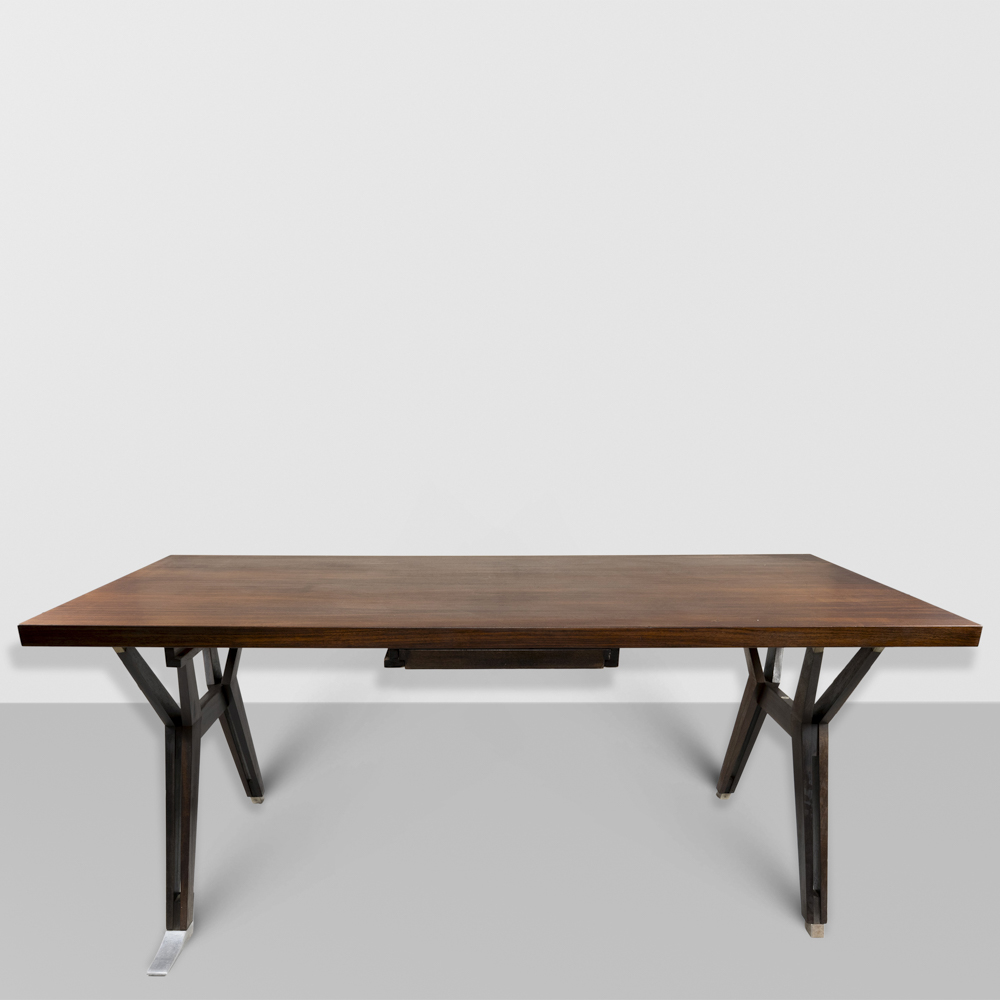 Ennio Fazioli, prod. MIMItalia, anni 6073x180x90 cm.scrivania mod. Tolomeo in legno ed alluminio, etichetta della produzione, mancanze