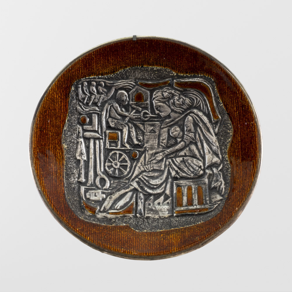Prod. Del CampoItalia, anni 70d. 23 cm.piatto in metallo argentato e smalto, ed. 39/50, marchio della produzione