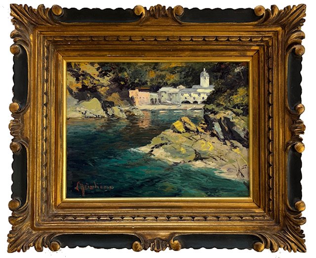Giuseppe Arigliano Genova 1917 - 1999 Veduta di San Fruttuoso Olio su tavola cm 18,5x24,5 firmato in basso a sx