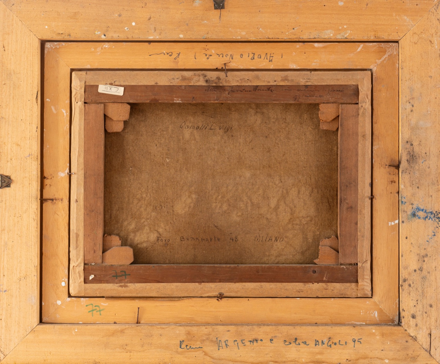al retro: sulla tela, firma e indirizzo del pittore (Foro Bonaparte 48 - MILANO); sul telaio, dedica di mano dell'artista (Alla signorina ...).
