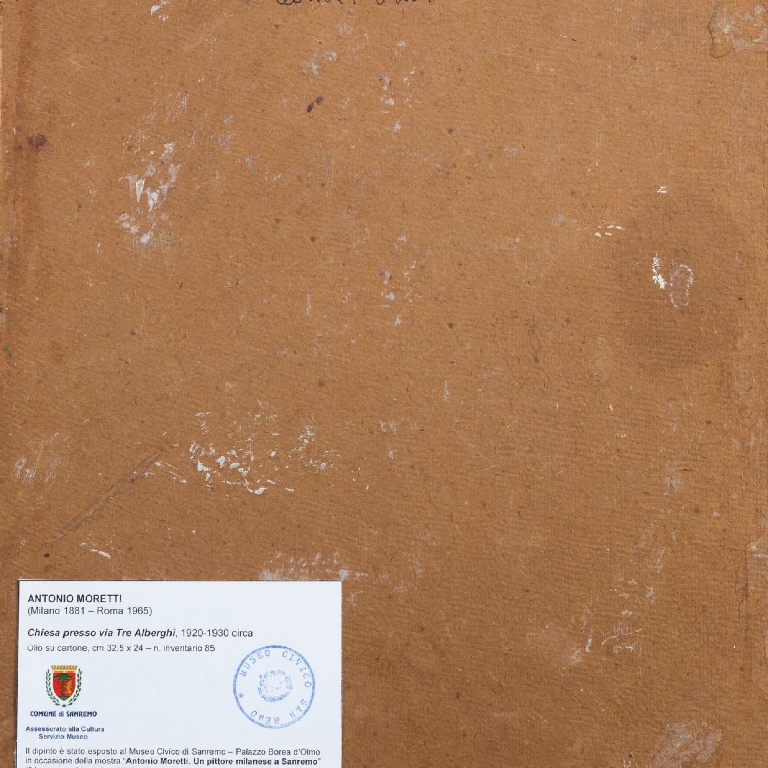 al retro, cartellino a stampa con riferimenti all'opera e timbro del Museo Civico di Sanremo in occasione della mostra Antonio Moretti. Un pittore milanese a Sanremo (21 marzo - 31 ottobre 2015)