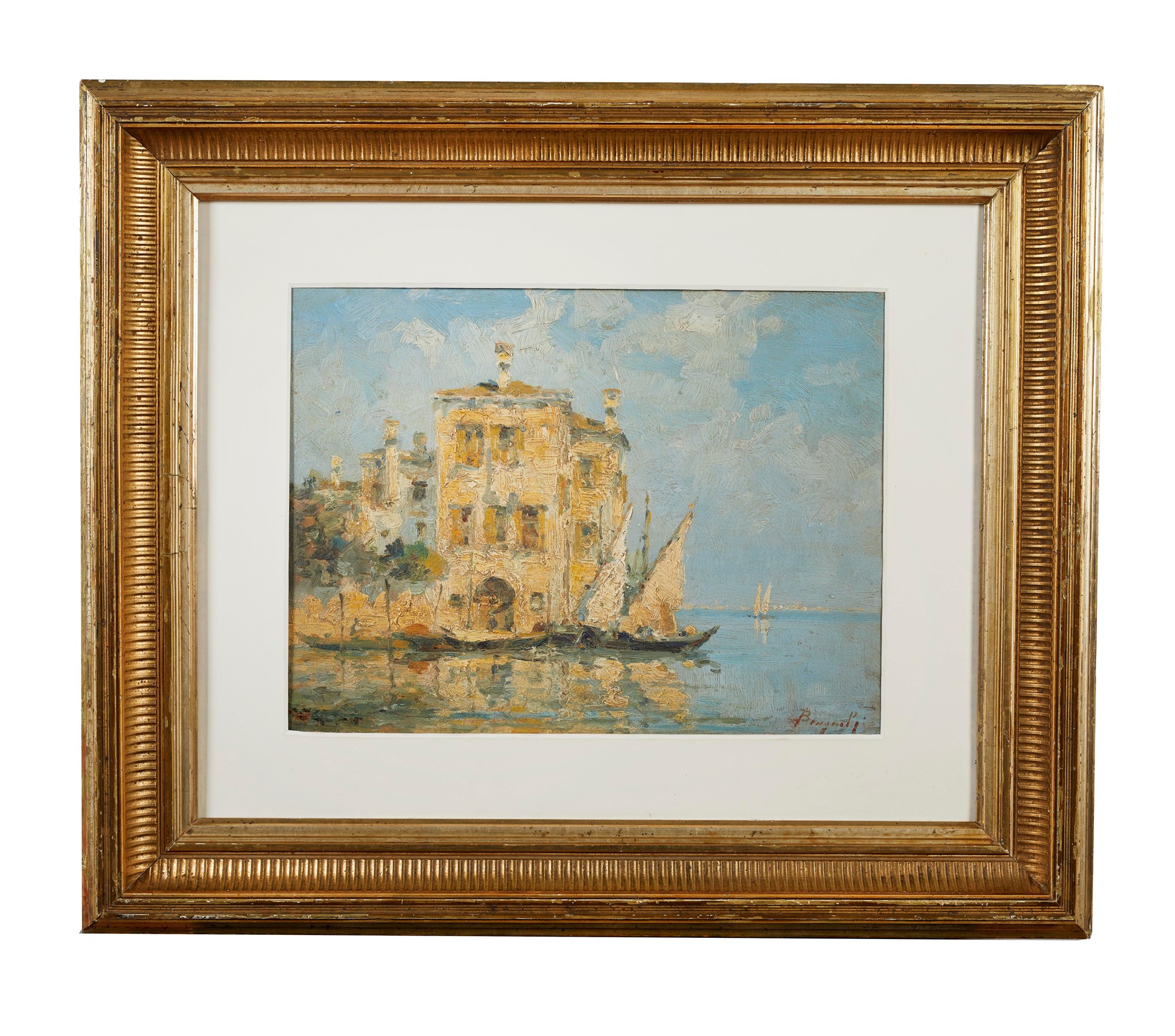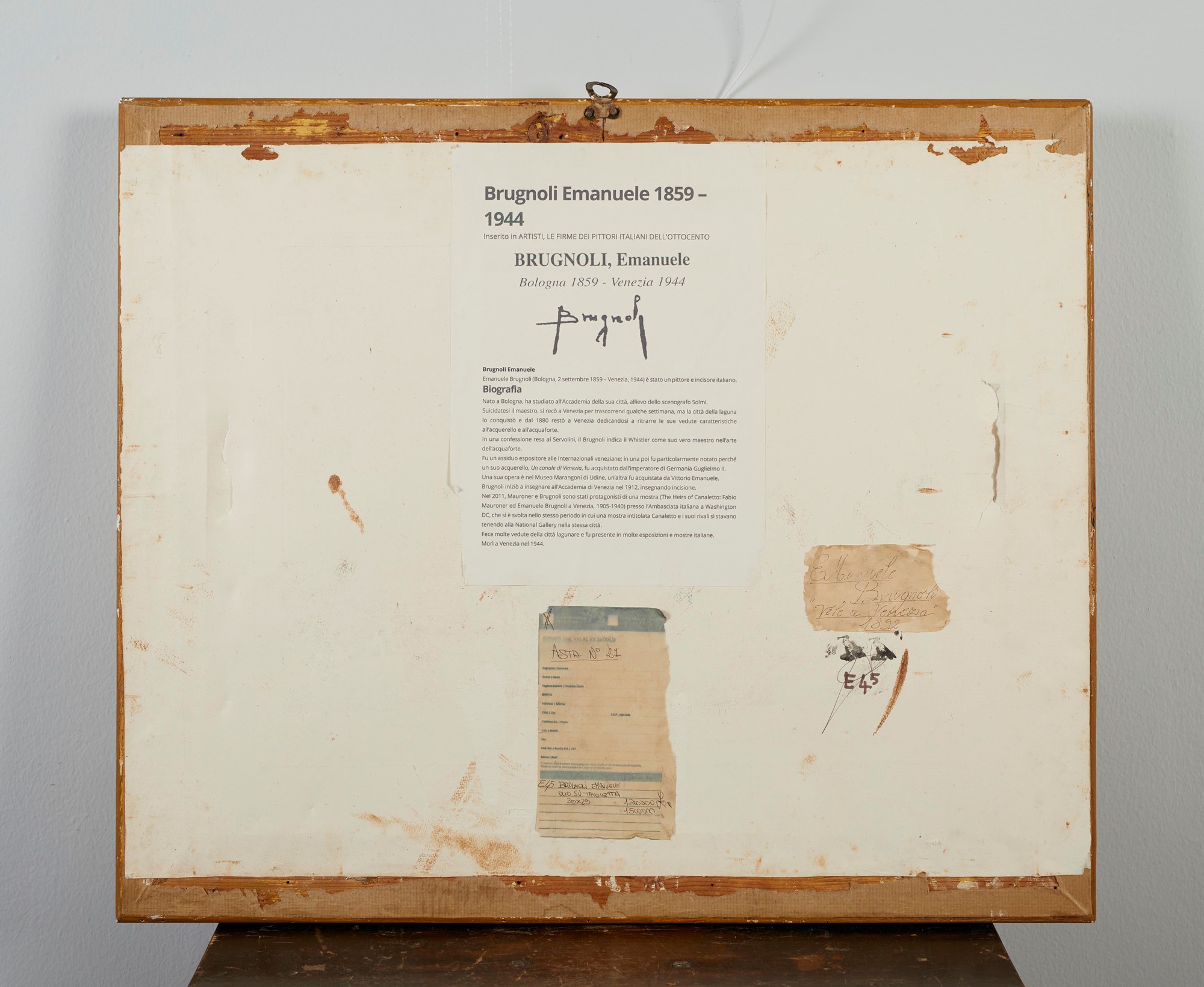 EMANUELE BRUGNOLI (Bologna, 1859 - Venezia, 1944) “Venezia”. Olio su tavola. Cm 30X40. Opera firmata in basso a destra Brugnoli. Al retro reca vecchio cartiglio d’asta.