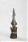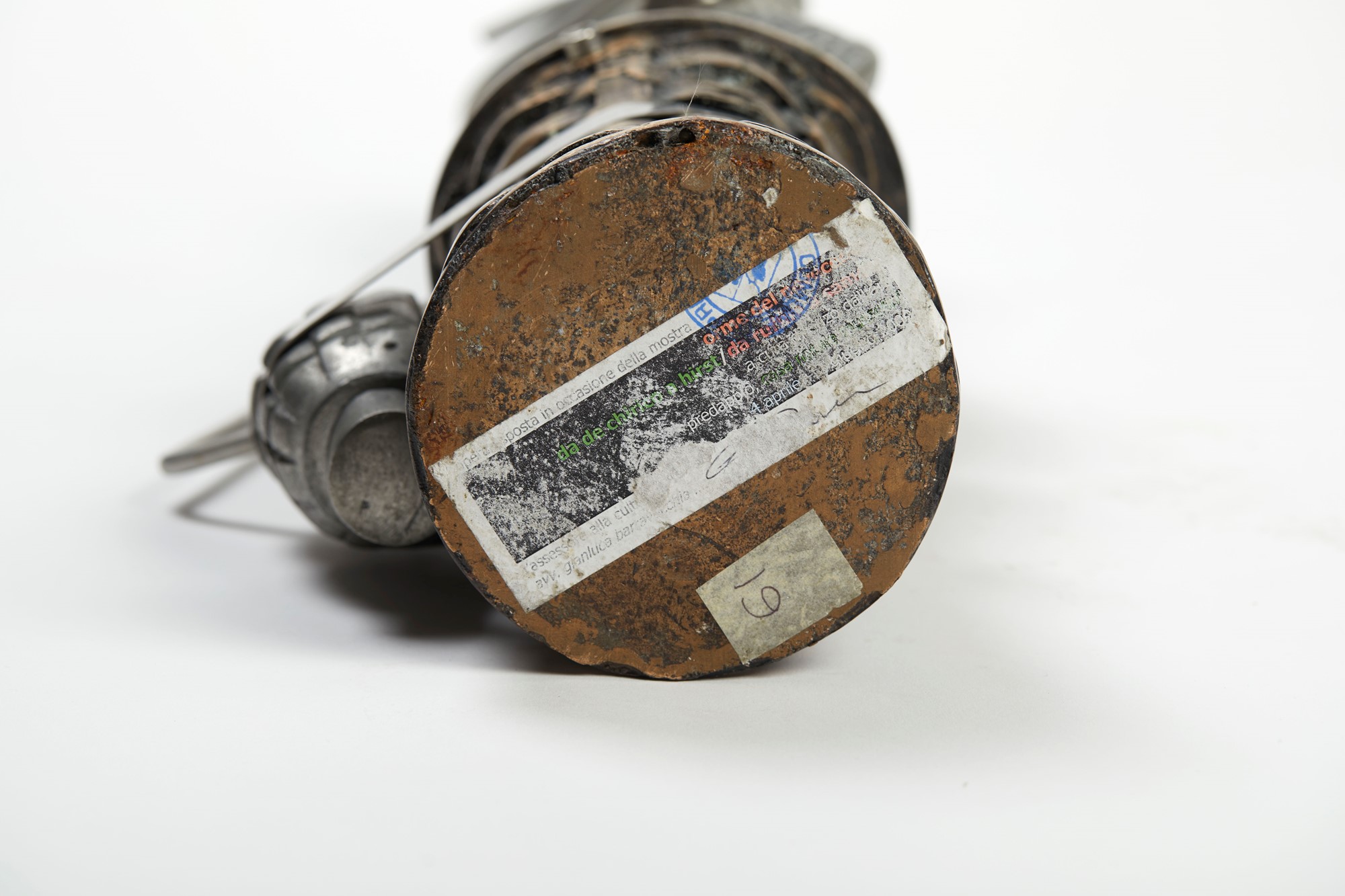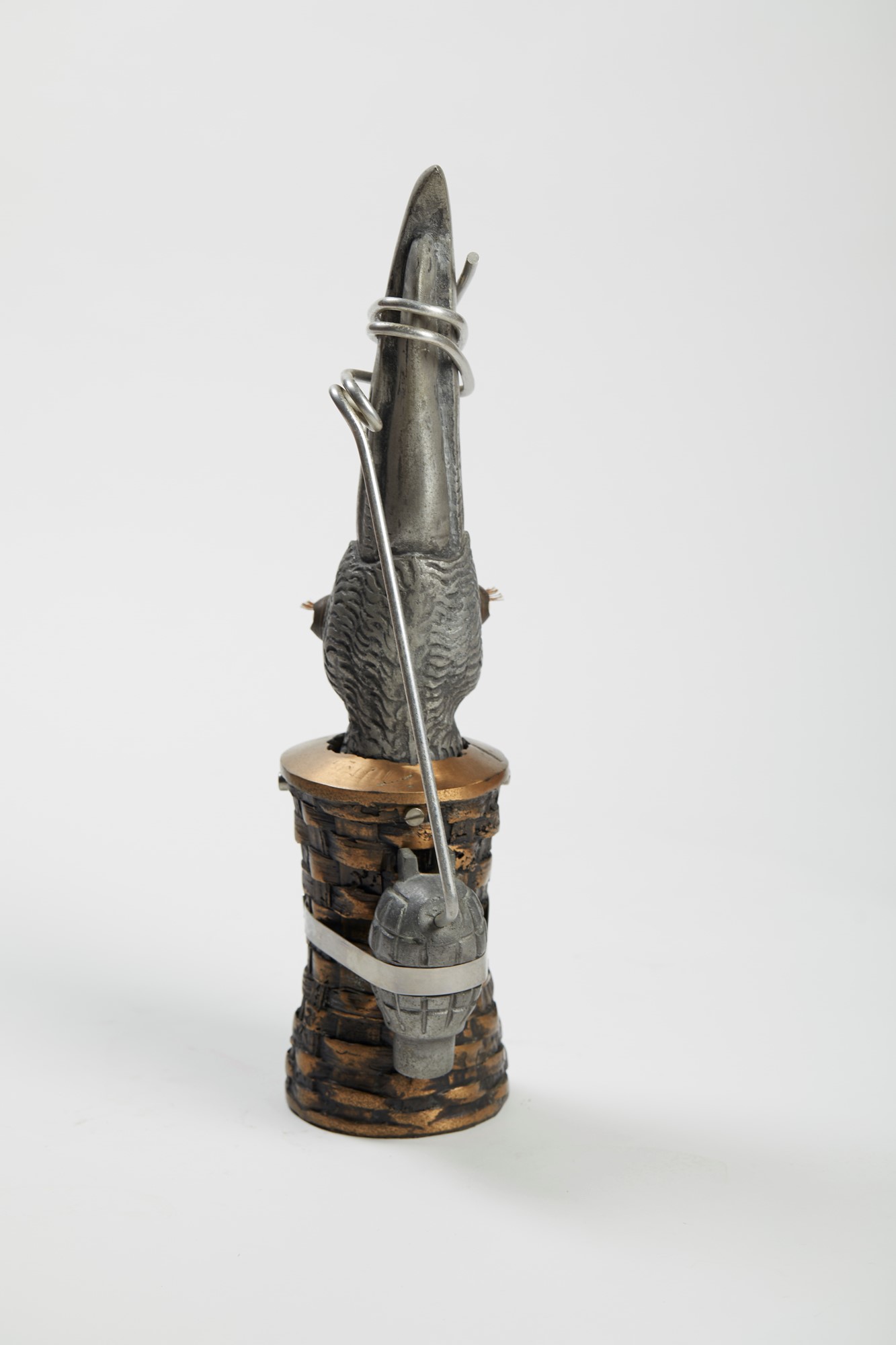 VALERIANO TRUBBIANI (Macerata 1937). “Chiudere il becco”, 1975. Scultura in bronzo e acciaio, esemplare unico. Cm 48,5x19x12. Opera firmata nel cerchio di bronzo al centro “Trubbiani”. Reca etichetta alla base “Opera esposta in occasione della mostra orme del ‘900, Predappio 2009”, firmata dall’Assessore alla cultura Avv. Gianluca Barravecchia. Reca timbro alla base. Opera pubblicata a colori in catalogo “Predappio 2009”.