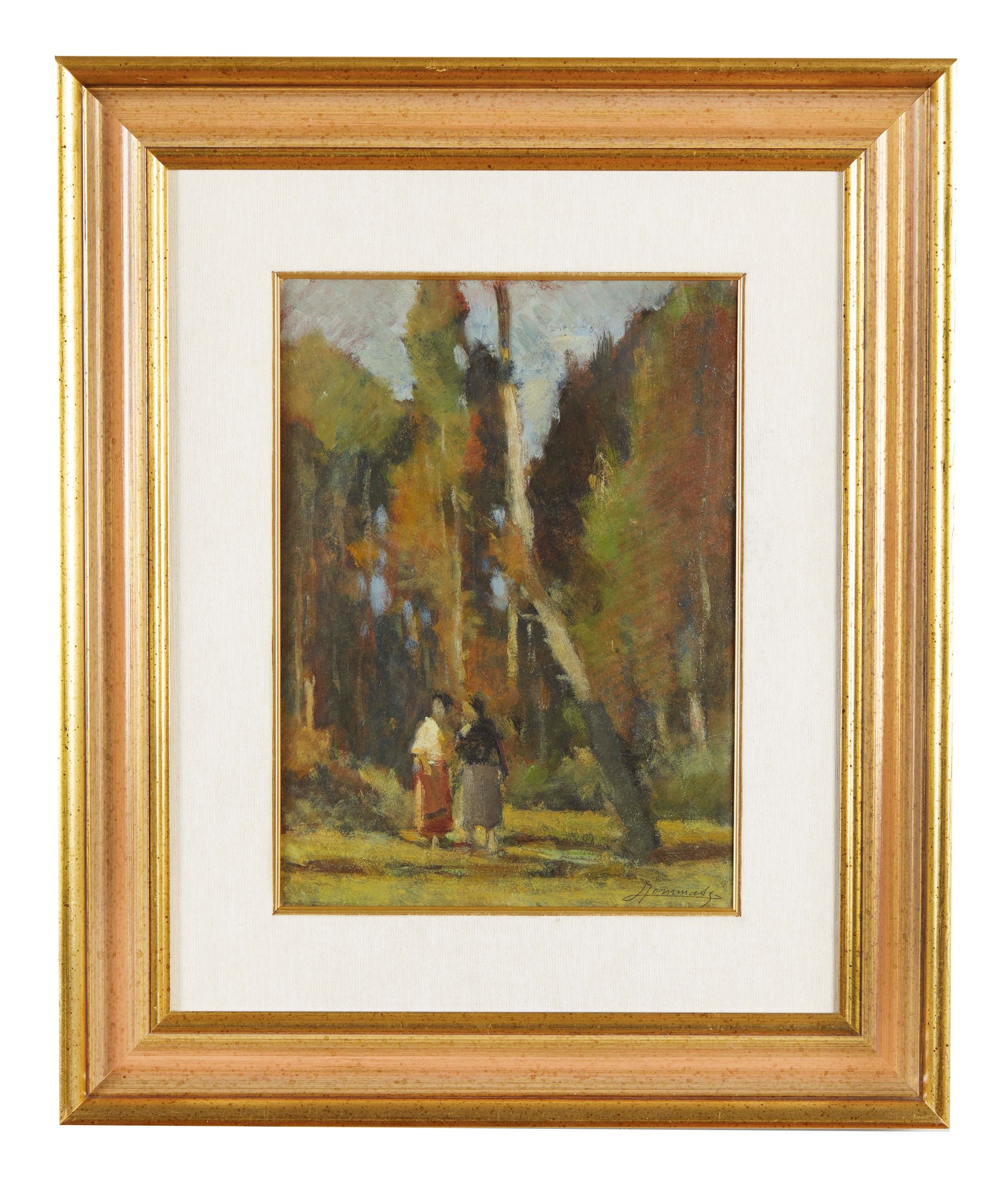 LUDOVICO TOMMASI (Livorno 1866 - Firenze 1941). “Paesaggio con figure”. Olio su cartone. Cm 37x27. Opera firmata in basso a destra Tommasi. Al retro reca attestato di autenticità a firma di Angiolino Tommasi.