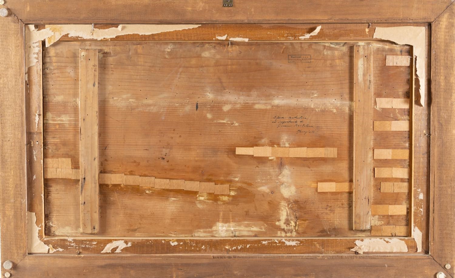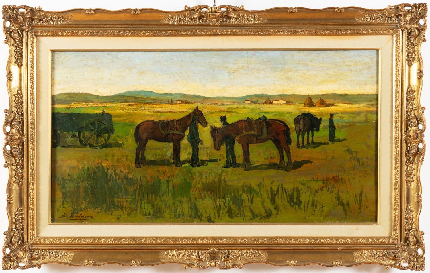 GIOVANNI BARTOLENA (Livorno 1866 - 1942) "Paesaggio di campagna con figure e cavalli". Olio su tavola. Cm 52x103. Opera firmata in basso a sinistra Gio Bartolena. Al retro reca timbro Manzoni sas Galleria d’Arte, Milano e iscrizione per autentica a firma M. Borgiotti “Opera autentica/ed importante di/Giovanni Bartolena”.