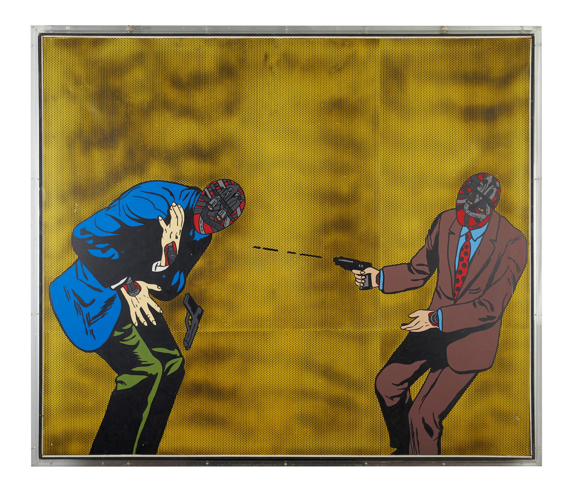 MAX HAMLET SAUVAGE (Gallipoli 1950) "Quinto non ammazzare", 1969. Olio acrilico su tela. Cm 120x140. Opera firmata e datata al retro A. Massimo 1969. Al retro reca timbro della Galleria Schettini, Milano.