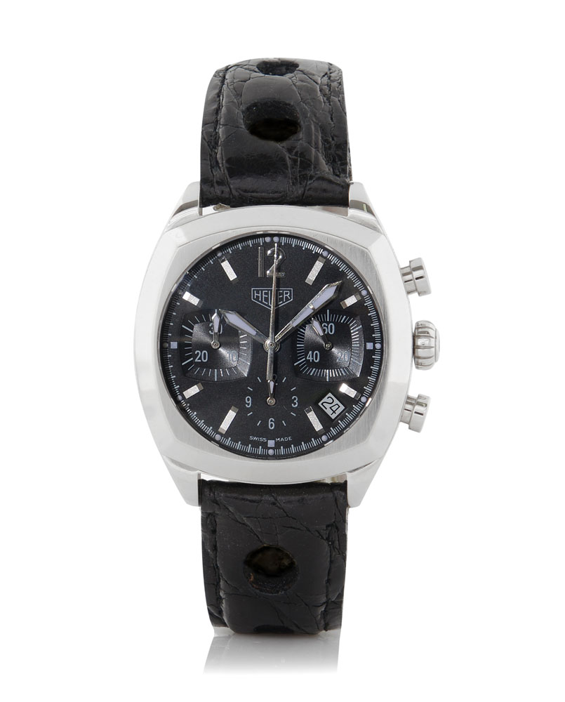 C. cushion-shaped, stainless steel with case back secured by screws, round buttons and sapphire crystal. D. black with applied indexes and Arabic numeral, 30 minute and 12 hour registers, date between 4 and 5. M. self-winding. Dial, case and movement signed. Accompanied by Heuer stainless steel deployante clasp.