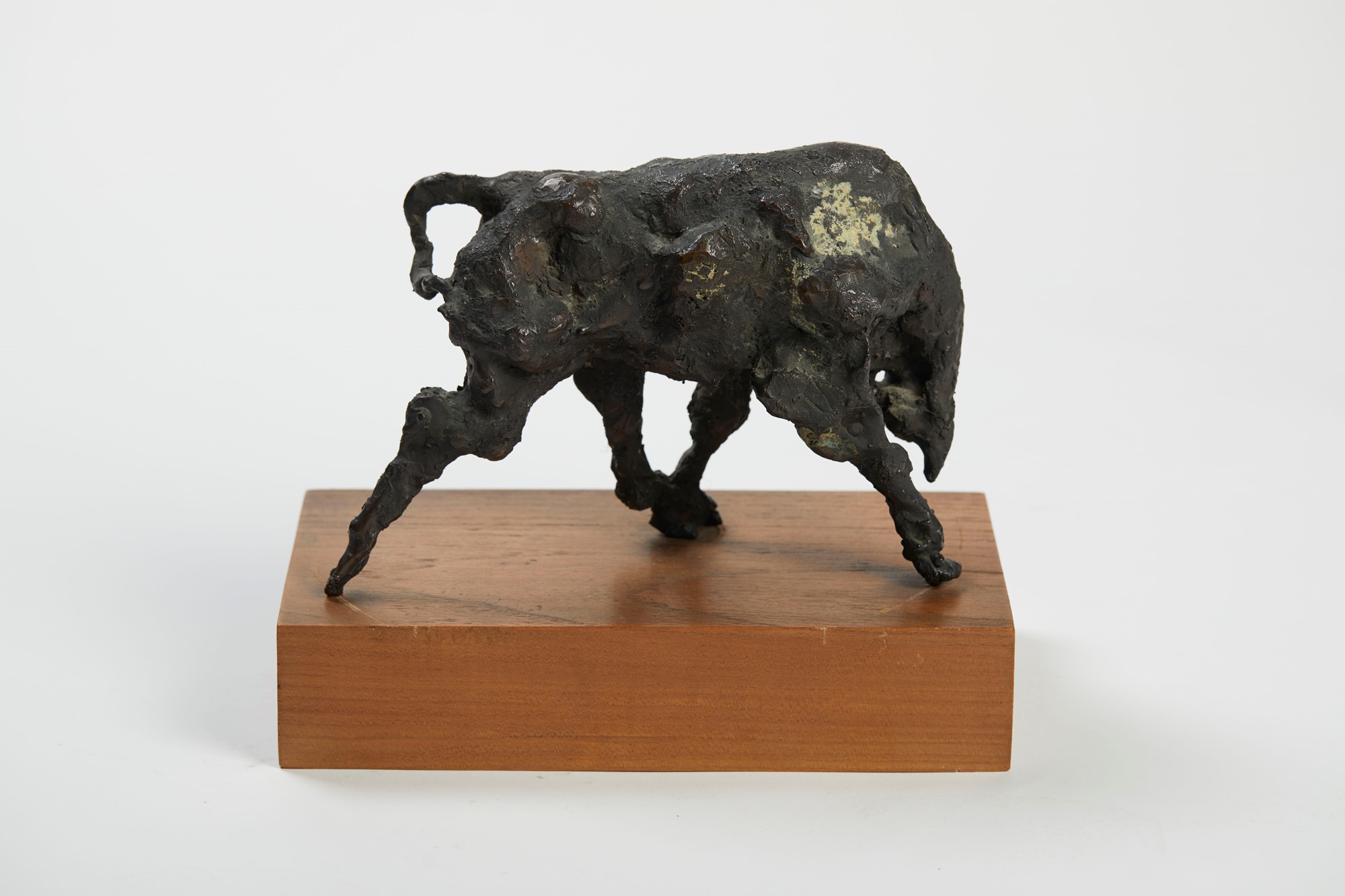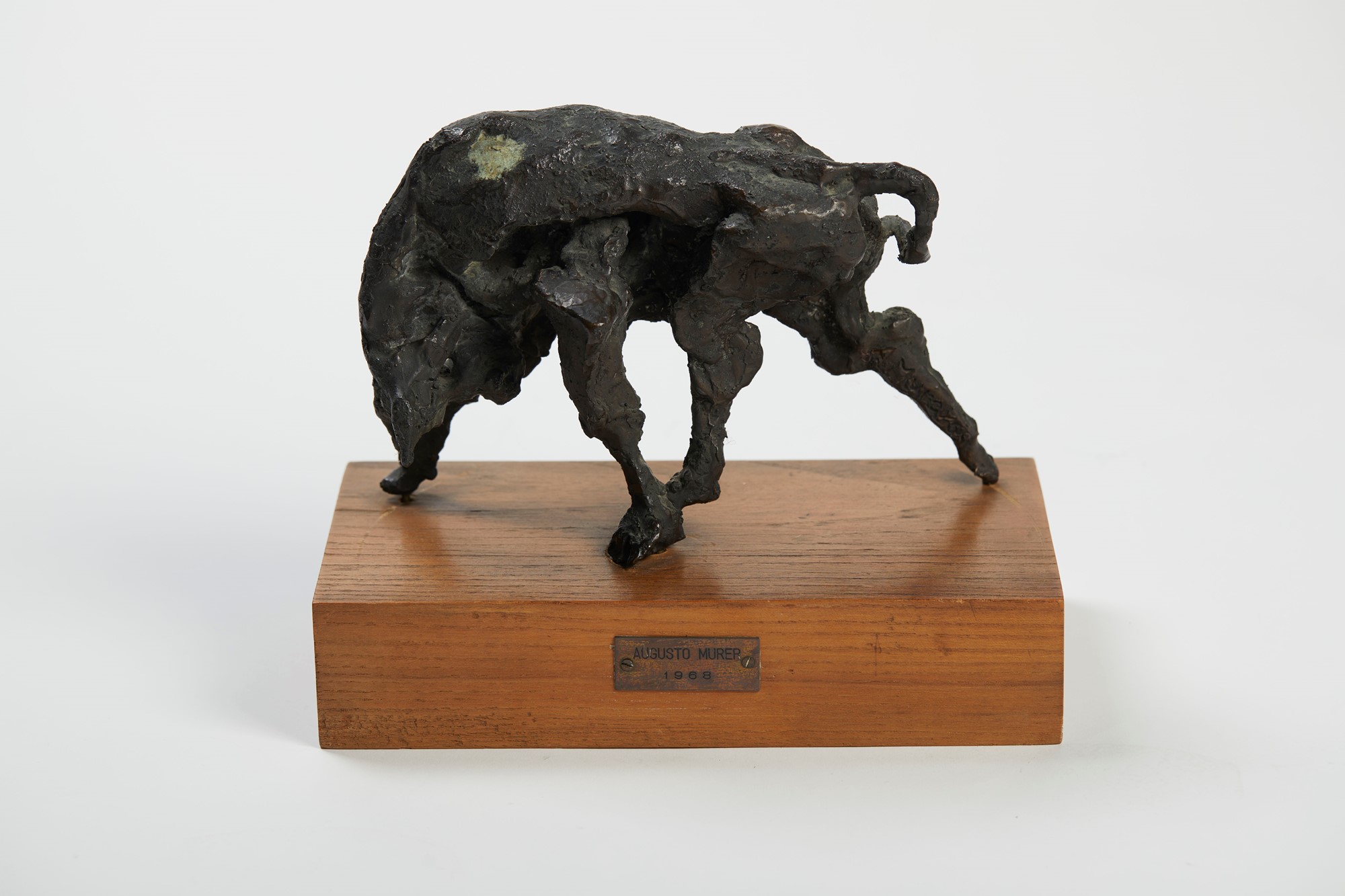 AUGUSTO MURER (Falcade 1922 - Padova 1985). “Toro”, 1968. Scultura in bronzo poggiante su base in legno. Cm 21,2x34x16. Opera firmata A. Murer sulla gamba destra posteriore.