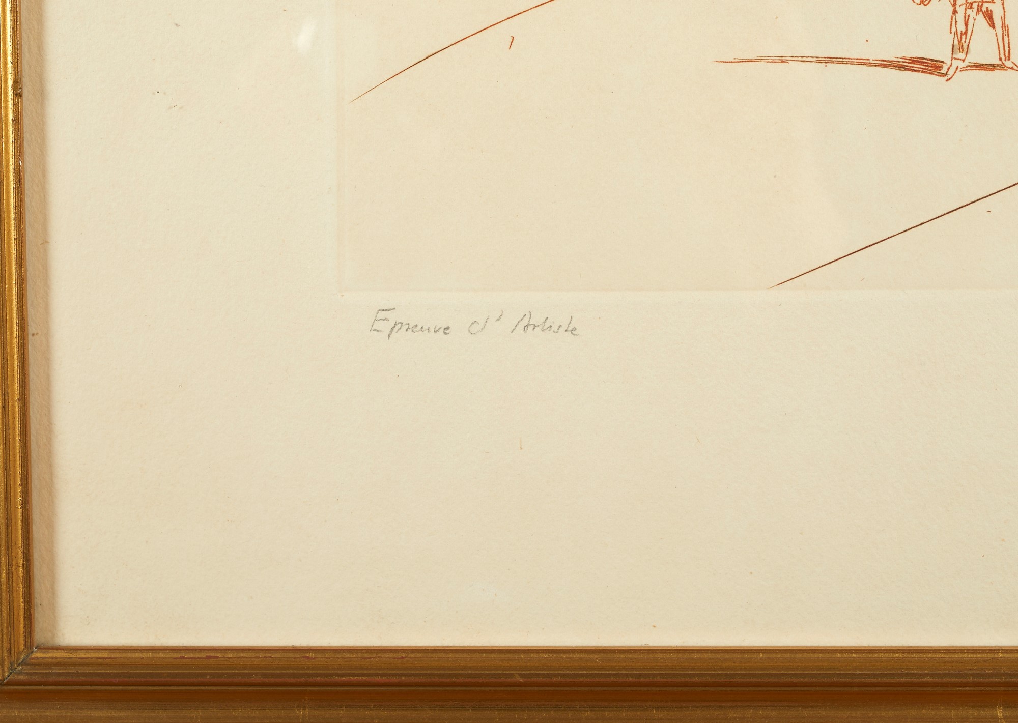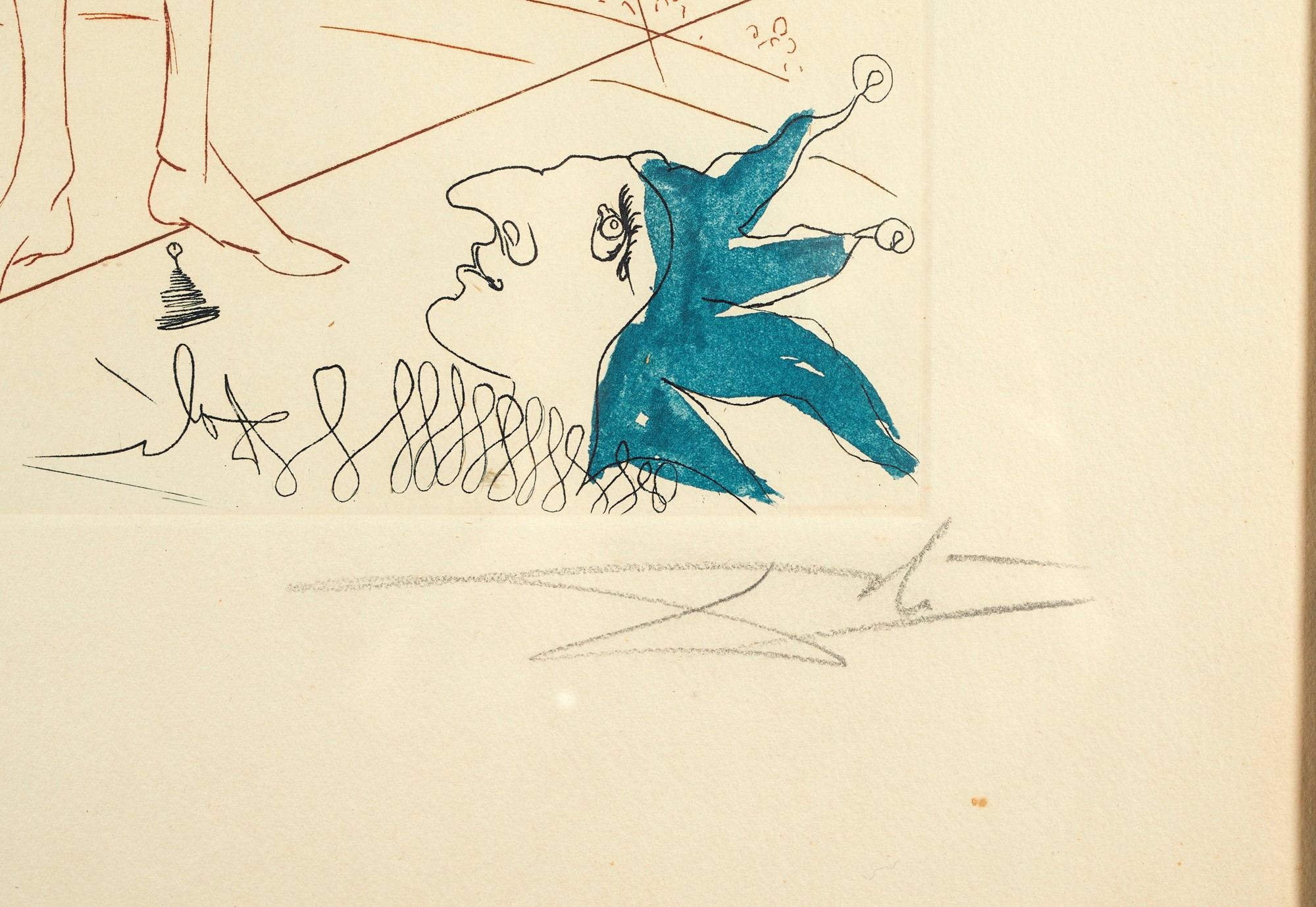 SALVADOR DALI' (Figueres 1904 - Figueres 1989) "Le Circque: Equilibriste", 1965. Incisione e acquatinta a colori su carta. Lastra cm 52,5x36,5. Opera firmata in basso a destra Dalì. Reca numeri di tiratura in basso a sinistra prova d'artista. Al retro reca etichetta della Galleria d'Arte La Loggia, Bologna.