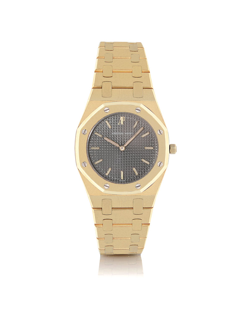 C. 18K yellow gold with octagonal-shaped case back and bezel secured by screws, sapphire crystal. D. guilloché dark grey with applied indexes. M. quartz. 18K yellow gold bracelet. Dial, case, movement and bracelet signed.