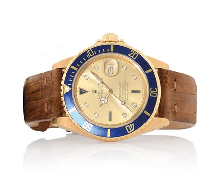 C. 18K yellow gold with screwed case back and crown, blue graduated and revolving bezel, sapphire crystal. D. champagne with diamond and sapphires indexes, luminous hands, centre seconds and date at 3. M. self-winding. Dial, case and movement signed. Accompanied by Rolex 18K yellow gold buckle.