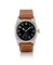 Cassa n. 23647 carré galbé in acciaio, lunetta godronata girevole con indicatore interno. Quadrante nero con numeri arabi e lancette luminescenti, secondi al 6. Movimento n. 7349275 a carica manuale. Quadrante, cassa e movimento firmati.