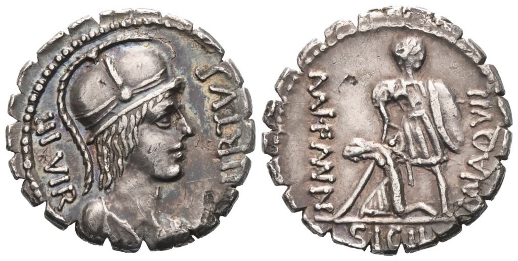 Helmeted and draped bust of Virtus r.; before, VIRTVS upwards; behind, IIIVIR downwards; Rv. MN AQVIL – MN·F MN·N (partially ligate) Warrior, holding shield in l. hand and lifting up fallen figure with r.; in exergue, SICIL. Crawford 401/1; Babelon (Aquillia) 2; Sydenham 798. Old cabinet tone, lovely iridescence. Good extremely fine.