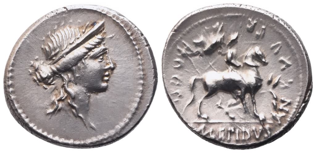 Diademed and laureate female head r.; Rv.Horseman r., carrying trophy over shoulder; around, AN XV PR H O C S; in exergue, M LEPIDVS. Crawford 419/1a; Babelon (Aemilia) 21 var.; Sydenham 827. Extremely fine.