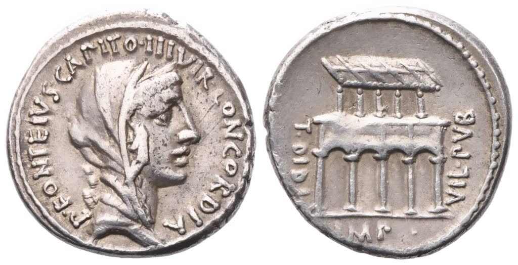 Head of Concordia r., wearing veil and diadem; around, P·FONTEIVS·CAPITO·IIIVIR·CONCORDIA; Rv. Villa Publica; on l., T·DIDI downwards; below, IMP; on r., VIL·PVB upwards. Crawford 429/2a; Babelon (Didia) 1, (Fonteia) 18; Sydenham 901a. Rare. Near extremely fine/extremely fine. Old cabinet tone.