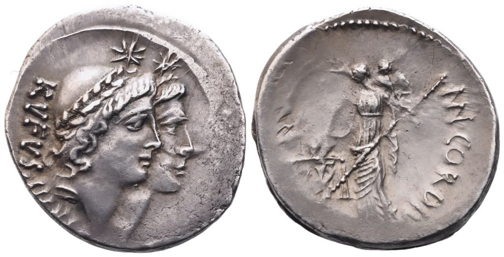 Jugate heads of Dioscuri to r.; RVFVS·III[·VIR] downwards behind; Rv. Venus Verticordia standing to l., holding scales and sceptre, Cupid at shoulder; MN·CORDIVS (MN ligate) downwards behind. Crawford 463/1a; Babelon (Cordia) 1; Sydenham 976. Old cabinet tone. Near extremely fine/extremely fine.