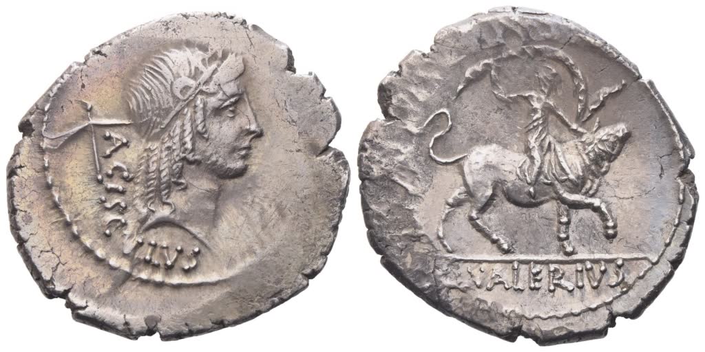 ACISCVLVS, head of Apollo Soranus r., hair in parallel corkscrew curls and held in taenia; dolabra (pickaxe) behind, [star above forehead], dotted border; Rv. L·VALERIVS, Europa riding bull r., holding her billowing veil above with both hands. Crawford 474/1b. Babelon (Valeria) 16; Sydenham 998. Old cabinet tone. Slight corrosion on the reverse, otherwise near extremely fine/extremely fine.