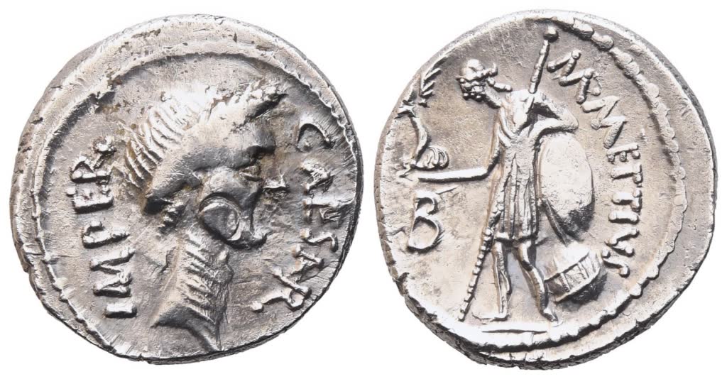 Wreathed head of Caesar r.; before, CAESAR downwards; behind, IMPER upwards; banker's mark on Caesar's cheek; Rv. Venus standing l., holding sceptre and Victory, and resting l. elbow on shield which in turn rests on globe; behind, M·METTIVS; in l. field, B (control letter). Crawford 480/17; Babelon (Julia) 33, (Mettia) 5; Sydenham 1055; Sear Imperators 101. Extremely fine.