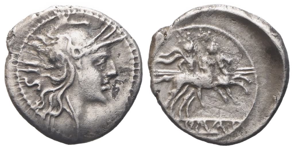 Mint: Rome (Crawford); uncertain Campanian mint (Castra Claudiana?) (Debernardi). Date: from 211 BC (Crawford); 215 BC (Debernardi). Helmeted head of Roma r., behind, IIS (mark of value); Rv. Dioscuri galloping r.; in linear frame, ROMA. Crawford 44/7; Debernardi Bs2. Good very fine.