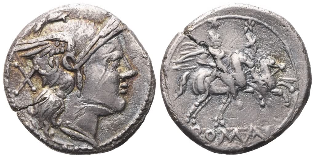 Mint: Central Italy (Crawford); uncertain Campanian mint (Castra Claudiana?) (Debernardi). Date: 211-208 BC (Crawford); 212 BC (Debernardi). Helmeted head of Roma r.; behind, X (mark of value); Rv. Dioscuri r.; below, ROMA in linear frame. Crawford 60/1c; Debernardi B28A. Flan crack at 10 o'clock on the reverse, otherwise good very fine. R4.
