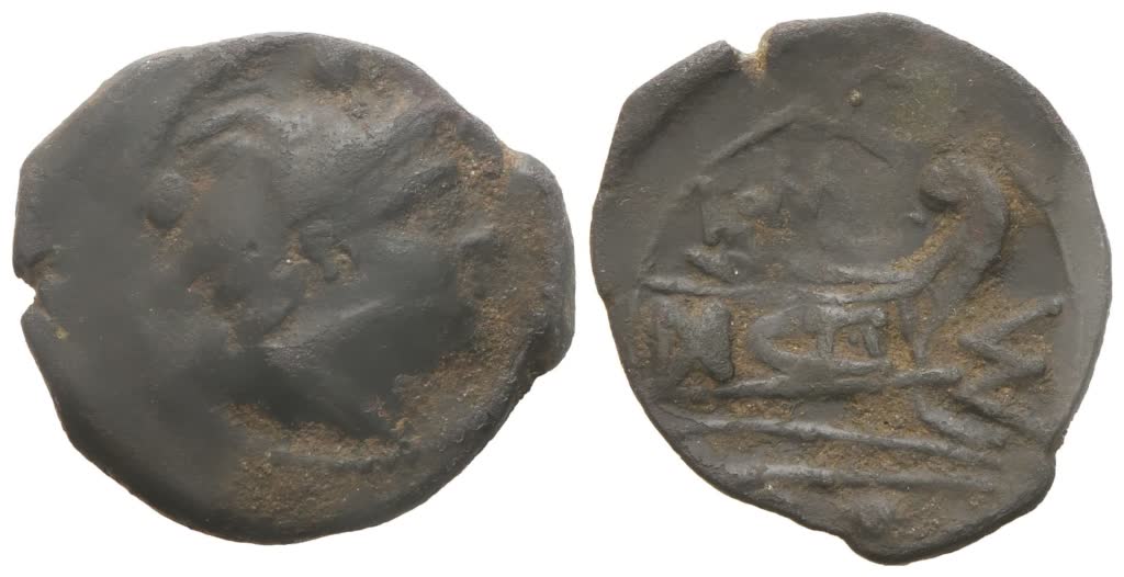 Uncertain Sardinian mint. Head of Mercury to r.; two pellets (mark of value) above; Rv. Prow of galley to right; MA (ligate) upwards to r., ROMA above, two pellets (mark of value) below. Crawford 64/6a; Sydenham 160c. Dark brown patina with sandy hues. Very fine.