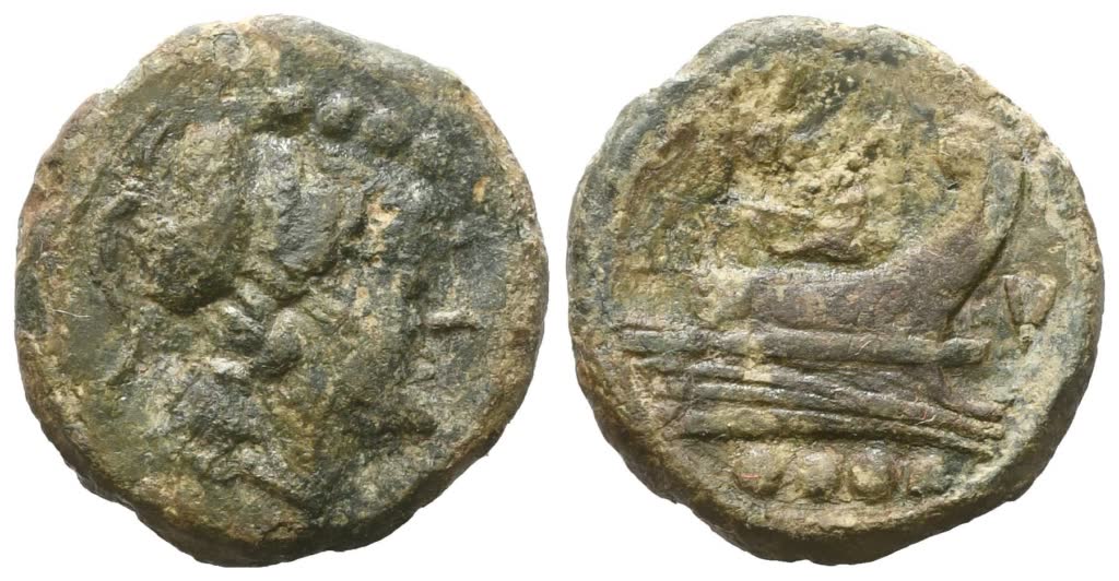 V series. Mint: uncertain mint in South-East Italy. Helmeted head of Minerva r. above, four pellets (mark of value); Rv. Prow r.; above, [ROMA]; before, V; below, four pellets (mark of value). On reverse is a dolphin, as decoration of superstructure of prow. Crawford 87/3; Sydenham 186b. Yellowish green patina. Good very fine. Scarce.