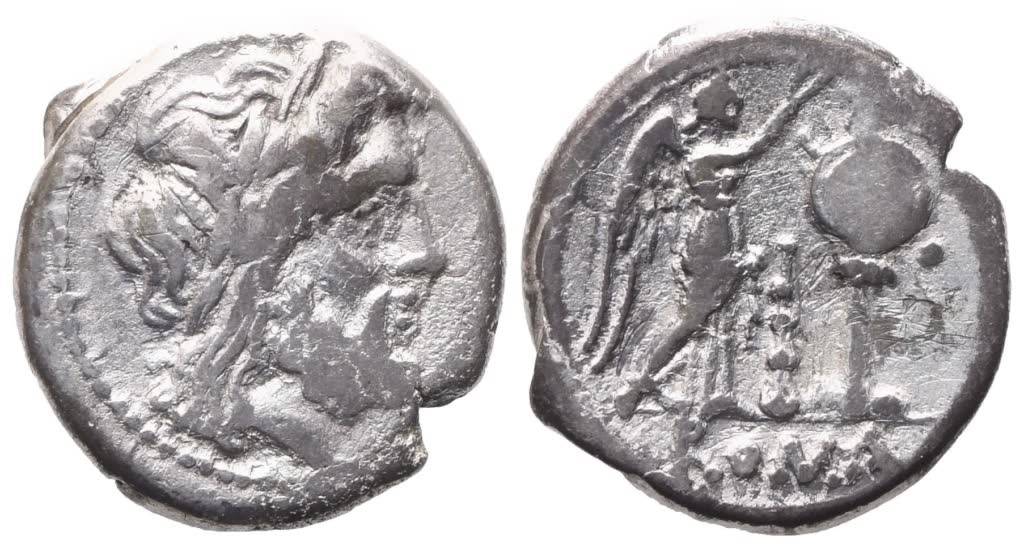 Mint: uncertain mint in South-East Italy. Date: 208 BC (Crawford); 209 BC (Debernardi). Laureate head of Jupiter r.; Rv. Victory r. crowning trophhy; between, club; in exergue, ROMA. Crawford 89/1a; Debernardi V30. Lustrous metal. Good very fine.