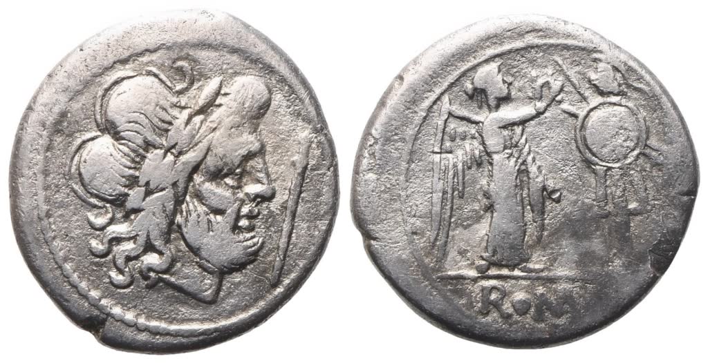Scipio (staff) series. Date: 206-195 BC (Crawford); 206 BC (Debernardi). Mint: Rome (Crawford); uncertain mint (Capua?) (Debernardi). Laureate head of Jupiter r.; before, scipio (staff); Rv. Victory r., crowning trophy; in exergue, ROMA. Crawford 112/1; Debernardi V35. Lustrous. Good very fine.