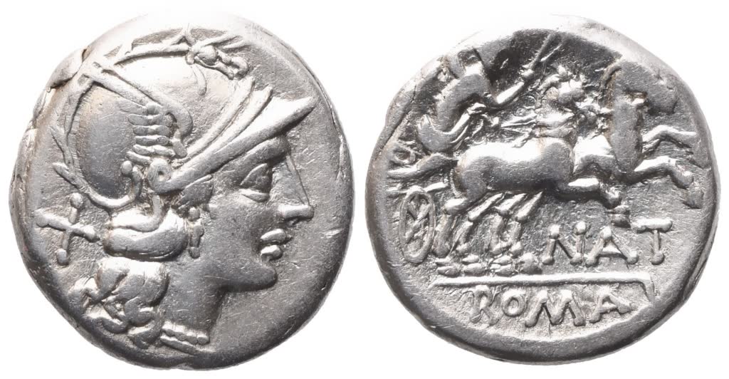 Helmeted head of Roma r.; behind, X (mark of value); Rv. Victory in prancing biga r.; below, NAT; ROMA in exergue. Crawford 200/1; Babelon (Pinaria) 2; Sydenham 382. Good very fine. Nice lustre.