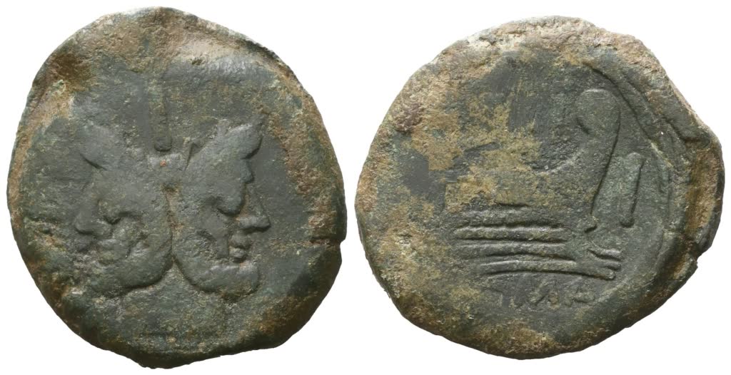Laureate head of Janus; above, I (mark of value); Rv. Prow r.; above, [M·ATIL]I; before, I (mark of value); below, [RO]MA. Crawford 214/2a (?). Untouched green patina with lighter hues. Near very fine.