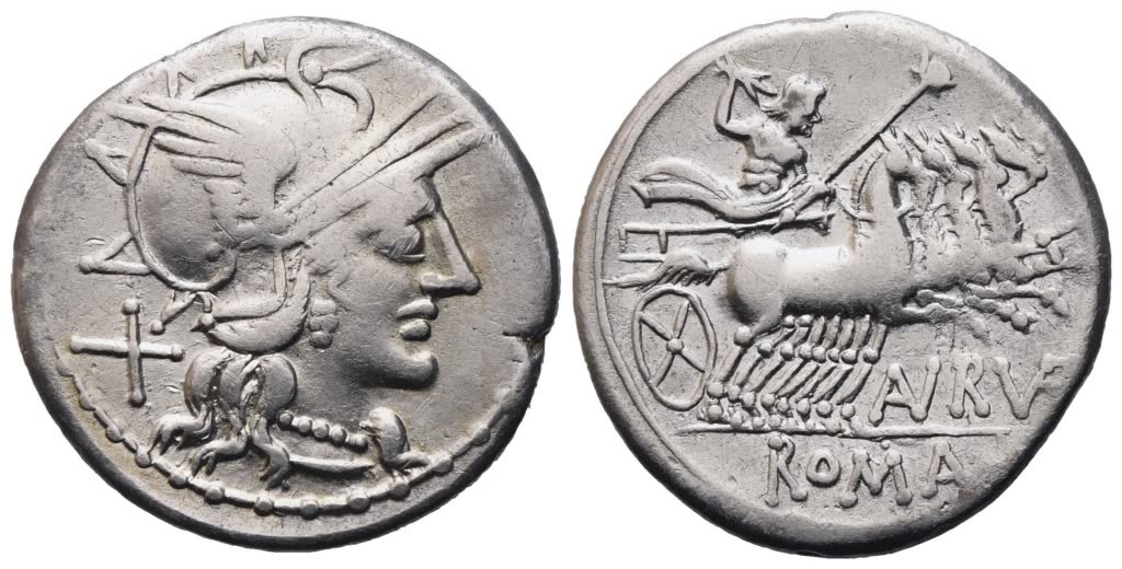 Helmeted head of Roma r; behind, X (mark of value); Rv. Jupiter in prancing quadriga r., holding sceptre with left hand and hurling thunderbolt with right; below, AN RVF (ligate) and ROMA in partial tablet. Crawford 221/1; Babelon (Aurelia) 19; Sydenham 409. Light cabinet tone. Lustrous. Good very fine.