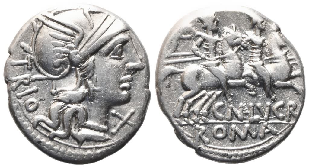 Helmeted bust of Roma r.; X (mark of value) before; TRIO behind; Rv. Dioscuri riding r., each holding a couched lance, stars above; CN·LVCR below; ROMA in exergue. Crawford 237/1a; Babelon (Lucretia) 1; Sydenham 450. Good very fine.