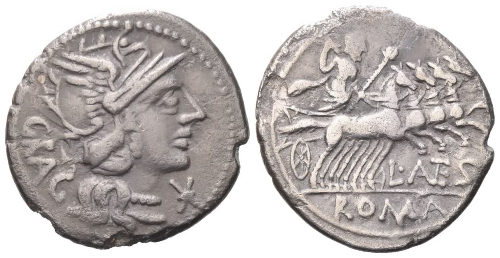 Helmeted head of Roma r., * (mark of value) before, GRAG behind; Rv. Jupiter in quadriga right, holding reins, thunderbolt and sceptre; L·ANTES (ligatured) below, ROMA in exergue. Crawford 238/1; Babelon (Antestia) 9; Sydenham 451. Very fine.