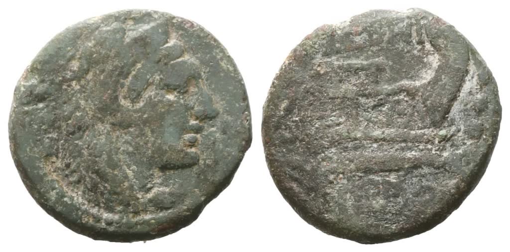 Mint: Rome. Head of Hercules to r. wearing lion's skin headdress; three pellets (mark of value) behind; Rv. Prow of galley to r., [L·T]REBANI above, [ROMA] below; three pellets (mark of value) to r. Crawford 241/4; Sydenham 457b; RBW 997. Greyish-green patina. Very fine.
