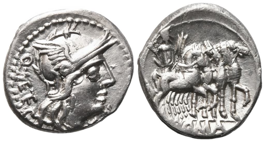Helmeted head of Roma right; Q·METE (ligate) behind, mark of value below chin; Rv. Jupiter driving quadriga r., holding thunderbolt and reins; in exergue, ROMA. Crawford 256/1; B. Caecilia 21; Sydenham 509. Pleasant old cabinet tone; lustrous metal. About extremely fine.