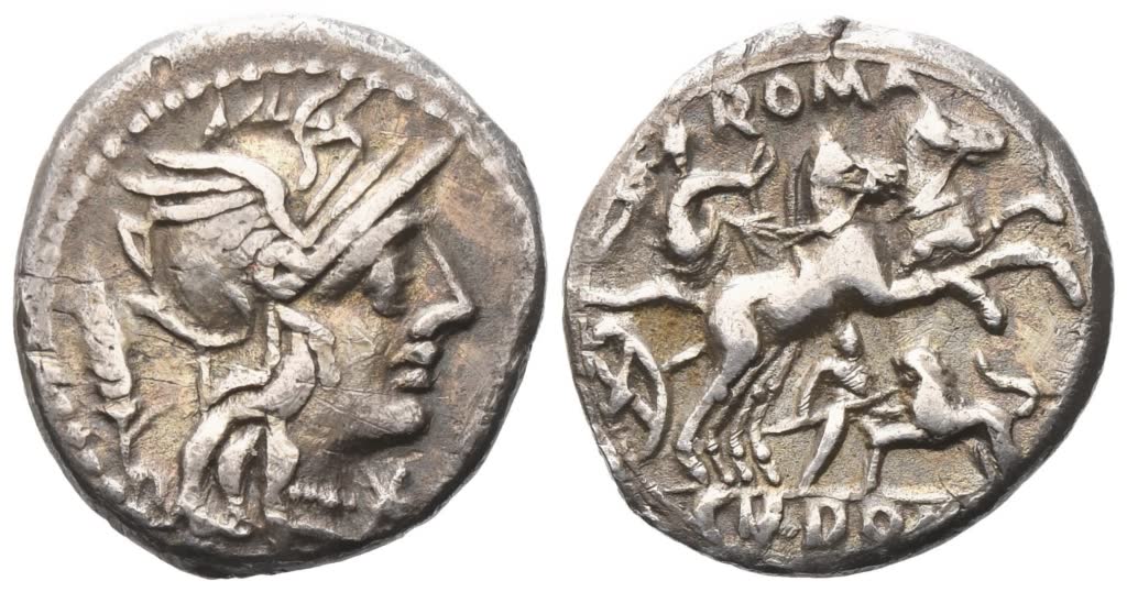 Helmeted head of Roma r., wheat ear behind, mark of value before; Rv. Victory in biga r., holding whip; below, man fighting a lion; ROMA above, CN·DOM in exergue. Crawford 261/1; Babelon (Domitia) 14; Sydenham 514. Good very fine.