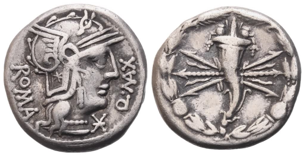 Helmeted head of Roma right, * (mark of value) below chin, ROMA behind and Q·MAX before (MA ligate); Rv. Cornucopia superimposed on thunderbolt, all within wreath. Crawford 265/1; Babelon (Fabia) 5; Sydenham 478. Old cabinet tone. Very fine.