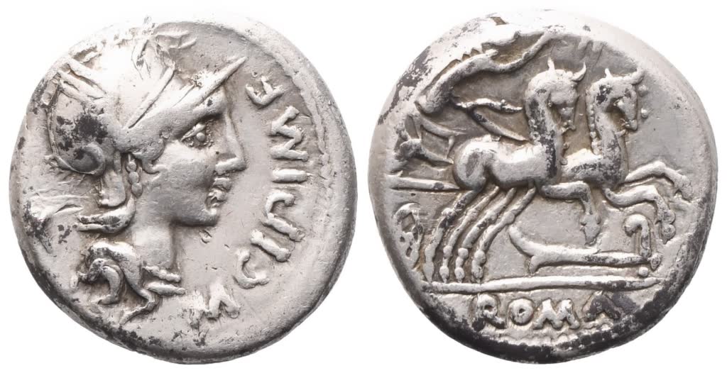 Helmeted bust of Roma right; before, M·CIPI·M·F upwards; X (mark of value) behind; Rv. Victory driving biga r., holding palm branch; rudder below; ROMA in exergue. Crawford 289/1; Babelon (Cipia) 1; Sydenham 546. Slight oxidation, otherwise good very fine.