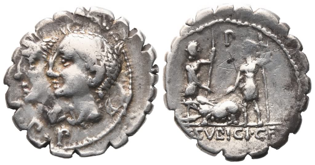 Jugate laureate heads of Dei Penates to l.; [D]·P·P downwards on l.; Rv. Two soldiers, each holding spear, swearing oath over sow; P (control letter) above, C·SVLPICI·C·F (partially ligate) in exergue. Crawford 312/1; Babelon (Sulpicia) 1; Sydenham 572. Nice cabinet tone. Very fine.