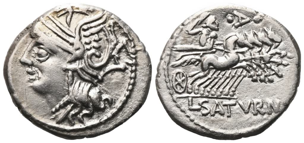 Helmeted head of Roma l.; Rv. Saturn driving galloping quadriga r., holding harpa in his r. hand; above, A (control mark) surrounded by two pellets; L·SATVRN in exergue. Crawford 317/3b; Babelon (Appuleia) 1; Sydenham 578a. Lustrous metal. Extremely fine.
