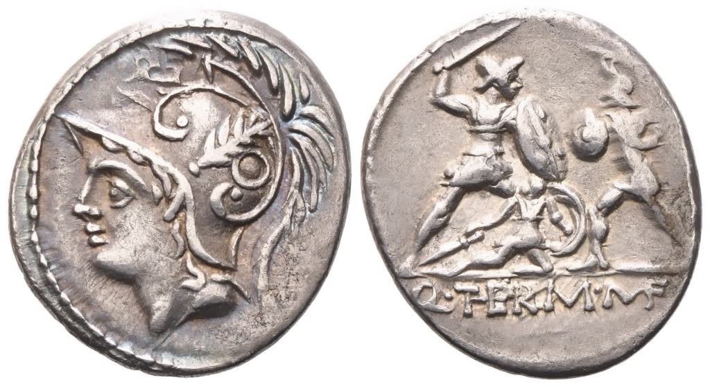 Helmeted head of Mars l; Rv. Roman soldier fighting enemy in protection of fallen comrade; in exergue, Q·THERM·MF (THE and MF ligate). Crawford 319/1; Babelon (Minucia) 19; Sydenham 592. Nice iridescent tone. Good very fine.