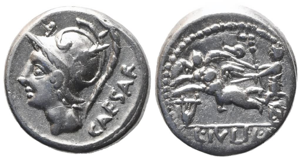 Helmeted head of Mars r.; CAESAR upwards behind, Q· above; Rv. Venus Genetrix in biga of Cupids l., holding sceptre in r. hand and reins in l.; lyre in lower l. field, Q· above, L·IVLI·L·F in exergue. Crawford 320/1; Babelon (Julia) 4; Sydenham 593. Good very fine. Lustrous.