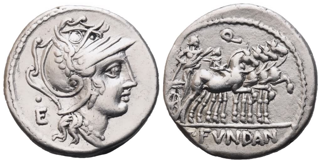 Helmeted head of Roma r.; behind, E (control mark) with pellet above; Rv. Triumphator in quadriga r., holding laurel branch and staff; on near horse, rider holding laurel branch. Above, Q; in exergue, [C]·FVNDAN. Crawford 326/1; Babelon (Fundania) 1; Sydenham 583. Lightly toned; lustrous. About extremely fine.