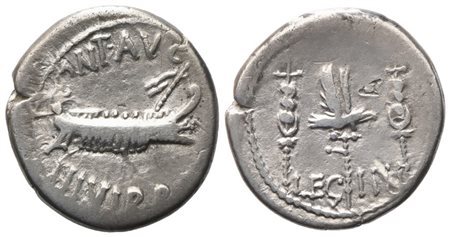 Military mint moving with Mark Antony (Patrae?). Praetorian galley moving to r.; above, ANT·AVG; below, III·VIR·R·P·C; Rv. Legionary eagle between two standards; LEG IIII across lower field. Crawford 544/16; CRI 353; Sydenham 1220. Very fine. Lustrous.