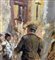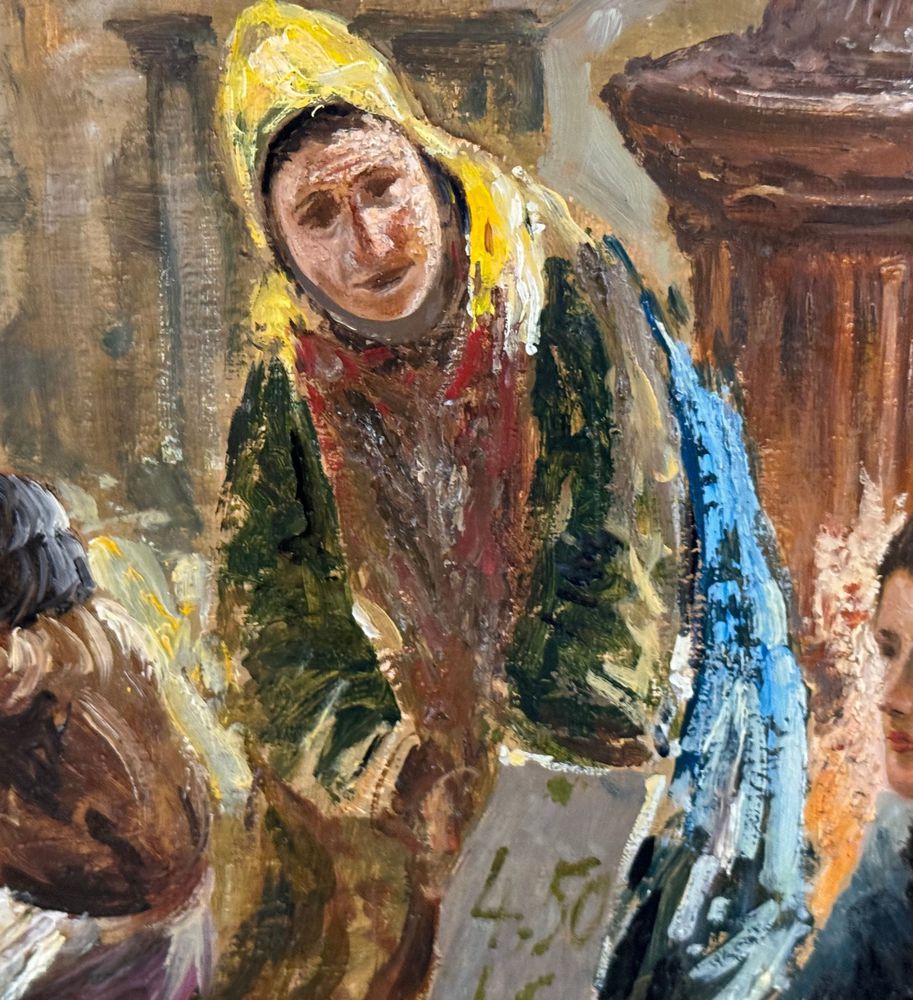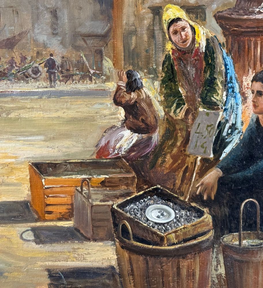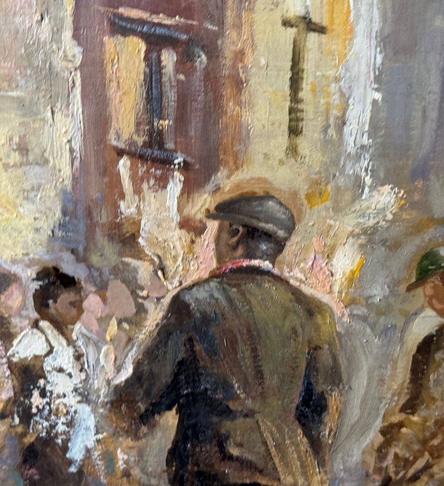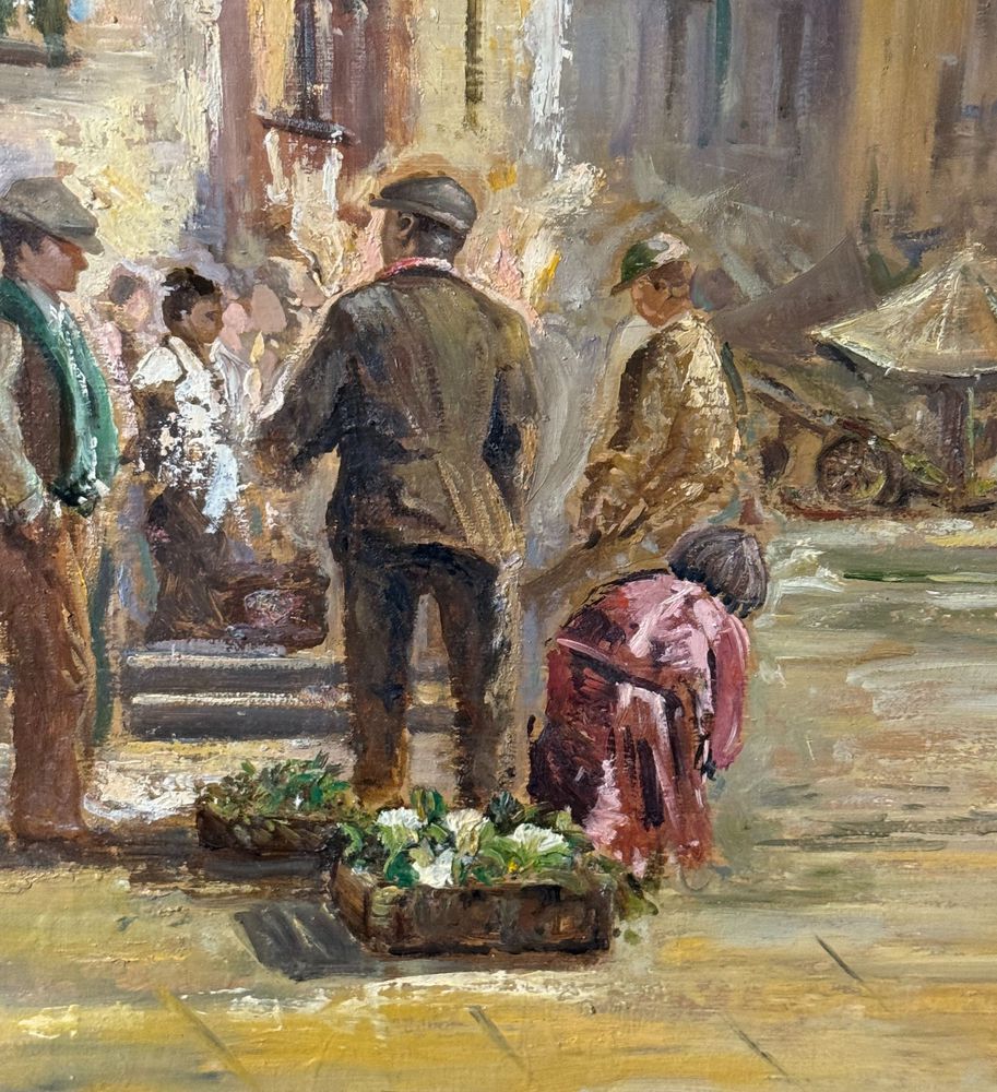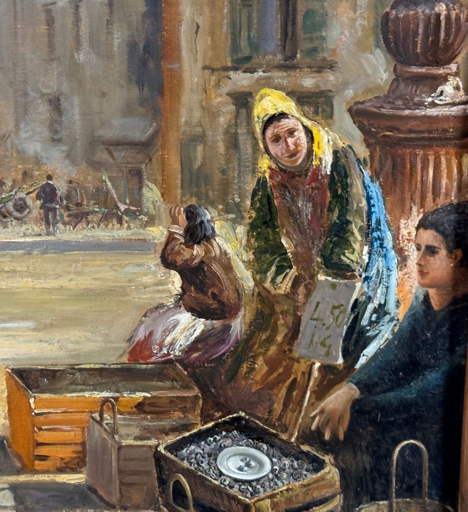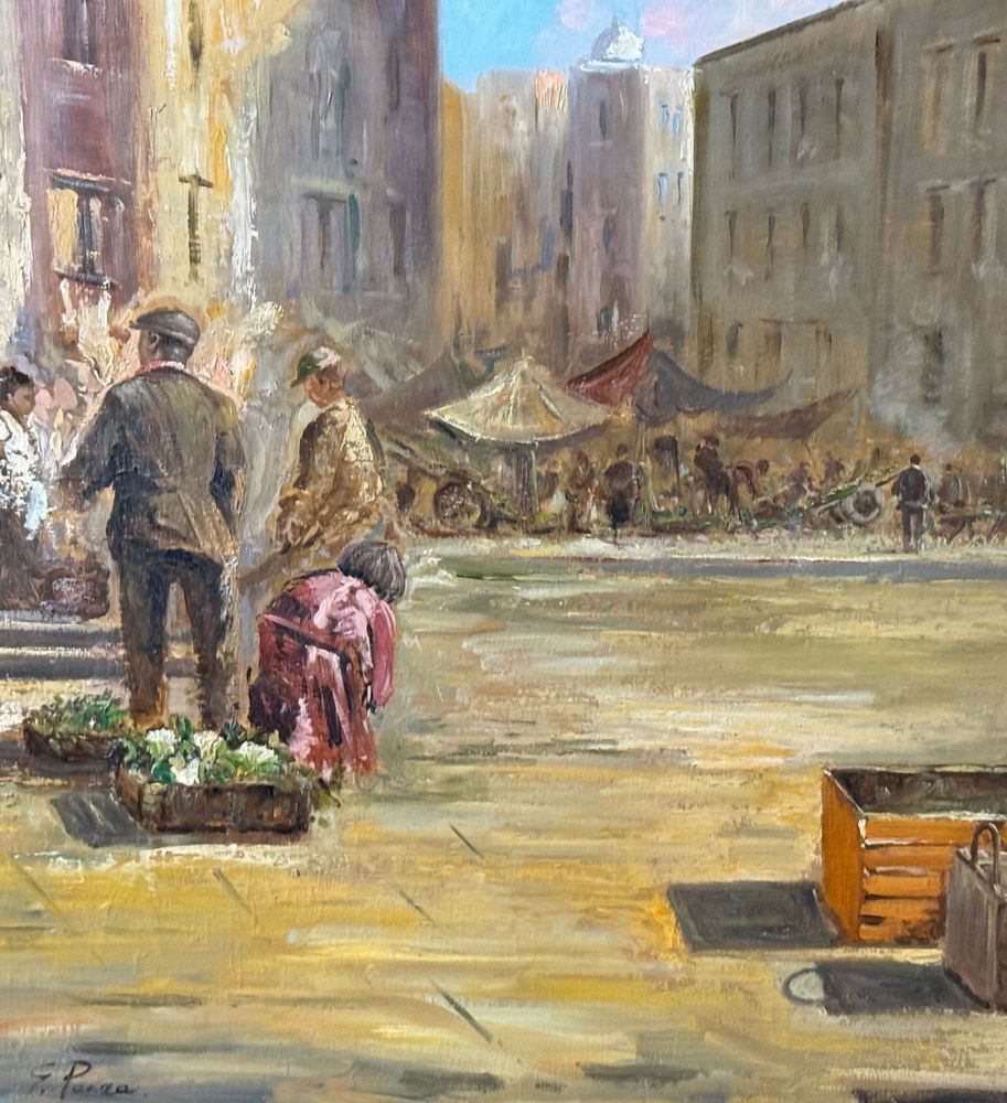 Dipinto olio su tela, periodo XX secolo scuola italiana, raffigurante Mercatino. Att. a Giovanni Panza. Dimensioni compreso cornice: 83x63 cm. Dimensioni interno cornice: 70x50 cm. Da artista anonimo. Opera in buone condizioni.