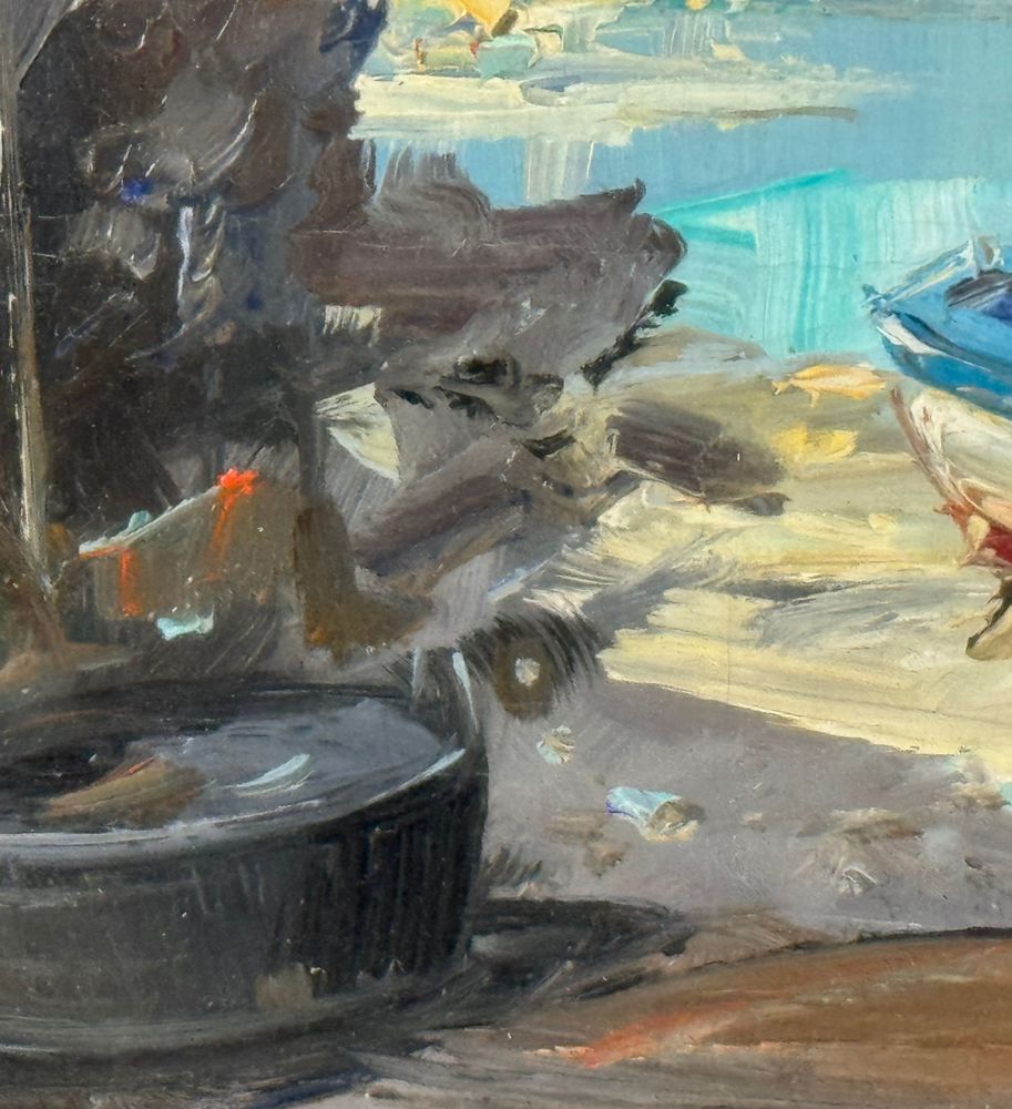 Dipinto olio su tela, periodo XX secolo scuola Napoletana, raffigurante Scorcio di marina con barca a secco. Dimensioni compreso cornice: 48x58 cm. Dimensioni interno cornice: 31x41 cm. Reca firma in basso a destra artista non identificato. Opera in buone condizioni.